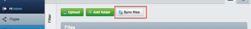 You may also notice the 'Sync files' button (highlighted below). This button allows CMS users to 'synchronise' the database (remember, all files/folders are stored as database records) with the filesystem. This is particularly useful if someone has uploaded or removed files/folders via FTP, for example.