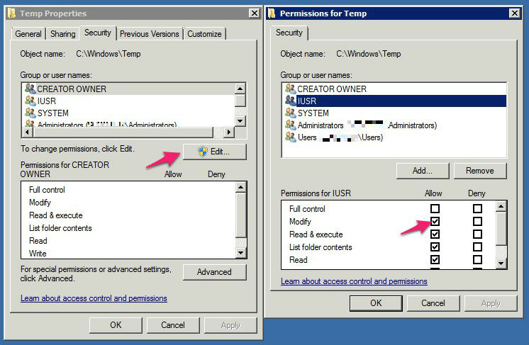 You will need to give Modify permission to IUSR user. To do it right click the folder and choose Properties. Then open the security tab, press Edit and add the IUSR user to the list by clicking the Add button. Afterwards tick Modify under Allow for that user. Repeat these steps for each folder.