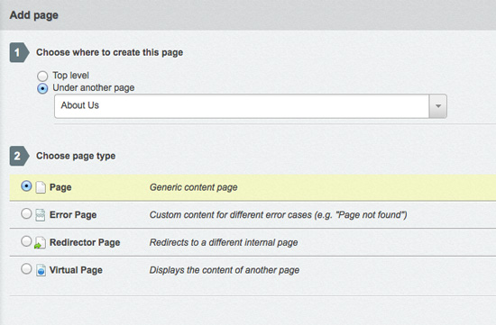 When you create a new page, you are given the option of setting the structure of the page ("Top level" or "Under another page") and the page type.