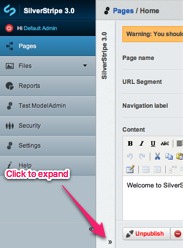 - Within the "Pages" section (provided you are in the "Content" or "Settings" tab) you can quickly move between pages in the CMS using the site tree. To collapse and expand this sidebar, click the arrow at the bottom. If you are in the history tab, you will notice the site tree has been replaced by a list of the alterations to the current page.
