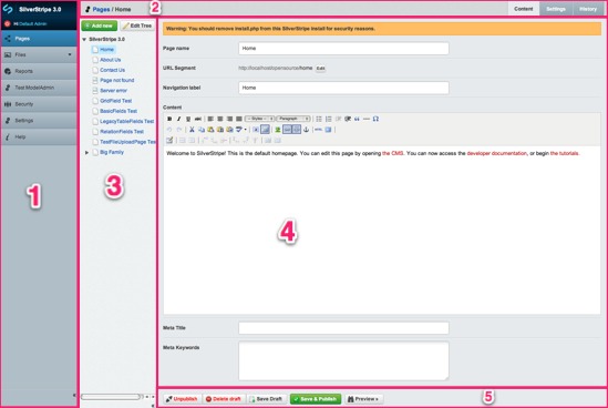 - The breadcrumbs on the left will show you a direct path to the page you are currently looking at. You can use this path to navigate up through a page's hierarchy. On the left there are tabs you may use to flick between different aspects of a page. By default, you should be shown three tabs: "Content", "Settings", and "History".