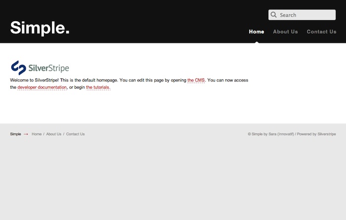 To create a new template layout, create a copy of Page.ss (found in themes/simple/templates/Layout) and call it HomePage.ss. If we flush the cache (?flush=1), SilverStripe should now be using HomePage.ss for the homepage, and Page.ss for the rest of the site. Now let's customise the HomePage template.