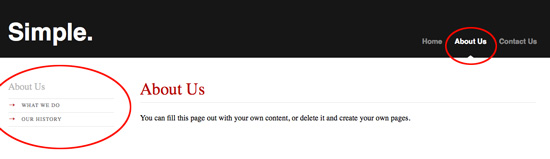 Select "Add New" in the Pages section, and create two new pages nested under the page "About Us" called "What we do" and "Our History" with the type "Page".