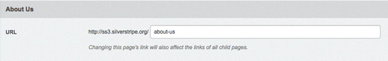 Note that if you have sub-pages, changing the Top level URL field for a page will affect the URL for all sub-pages. For example, if we changed the URL field "/about-us/" to "/about-silverstripe/" then the sub-pages URLs would now be "/about-silverstripe/URL-of-subpage/" rather than "/about-us/URL-of-subpage/".
