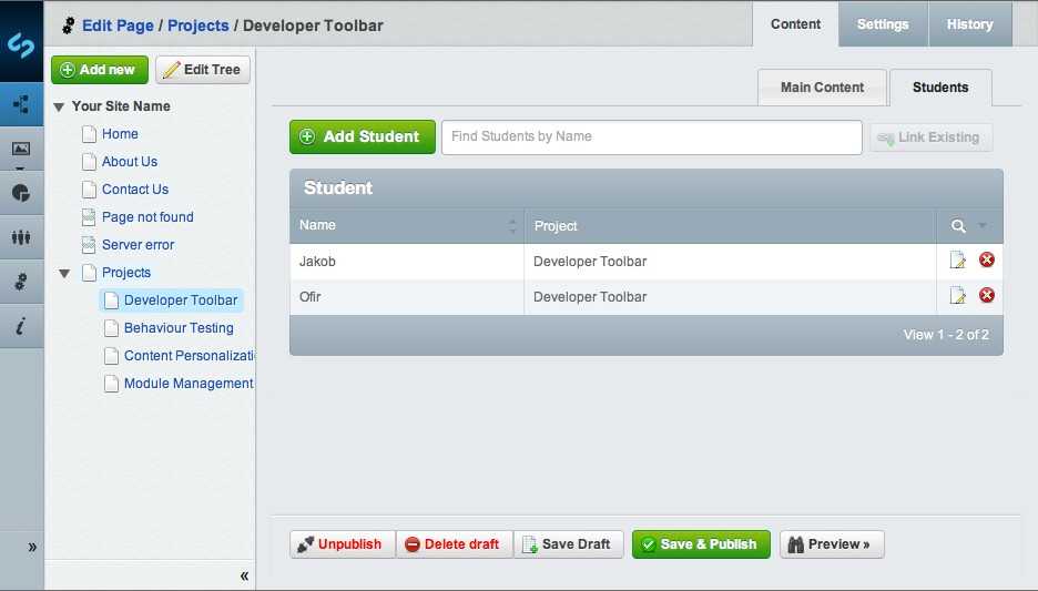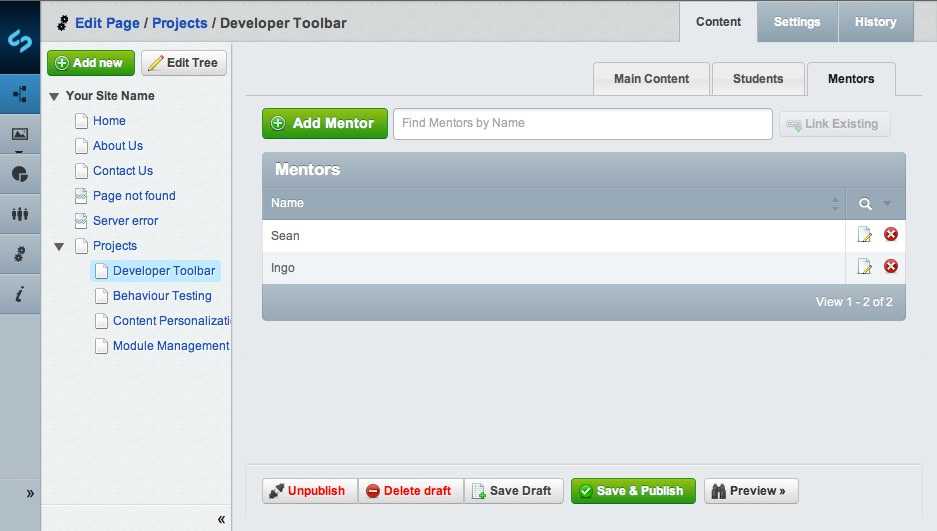 To demonstrate relationships between objects, we are going to use the example of students working on various projects. Each student has a single project, and each project has one or more mentors supervising their progress. We'll create these objects, make them editable in the CMS, and render them on the website.